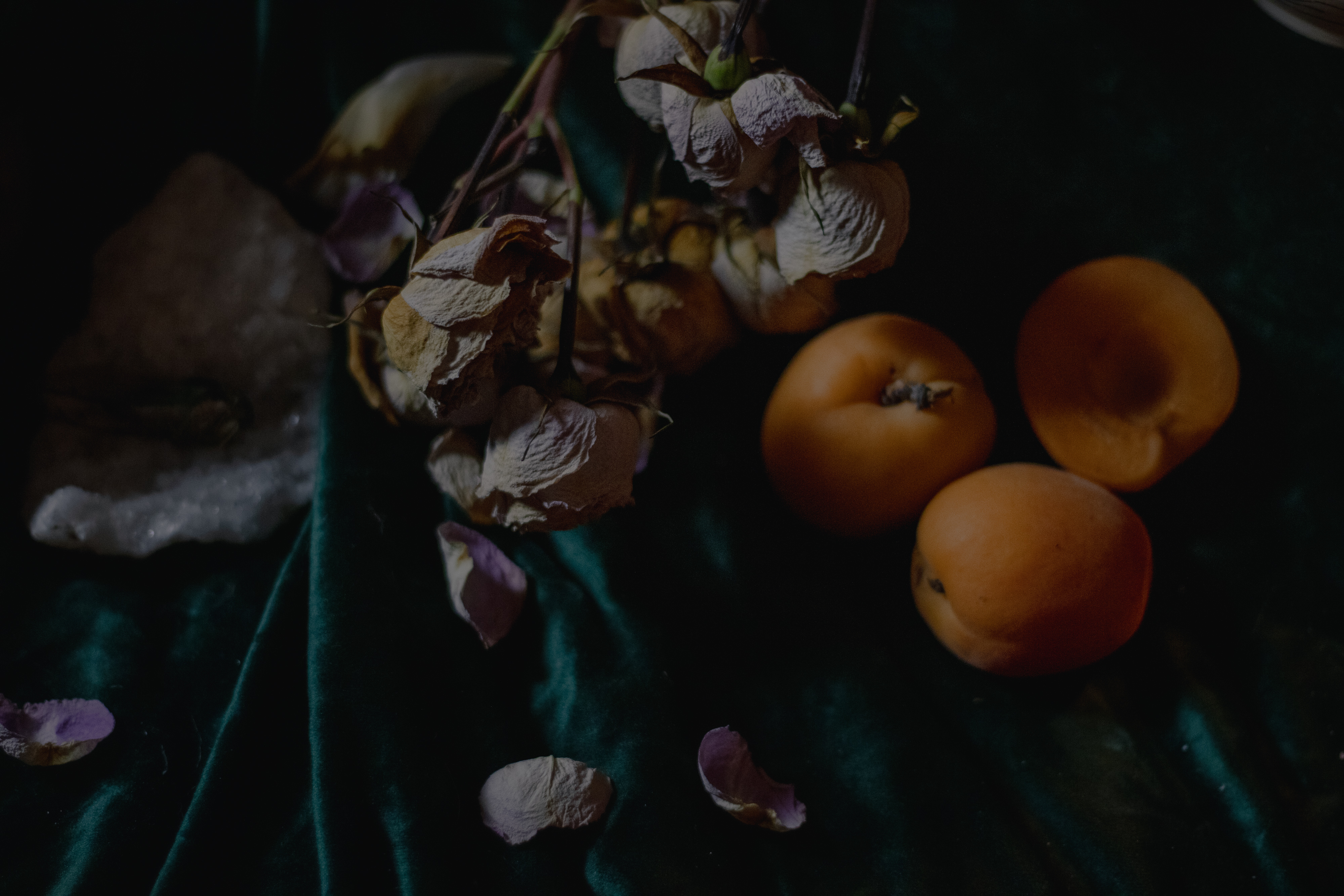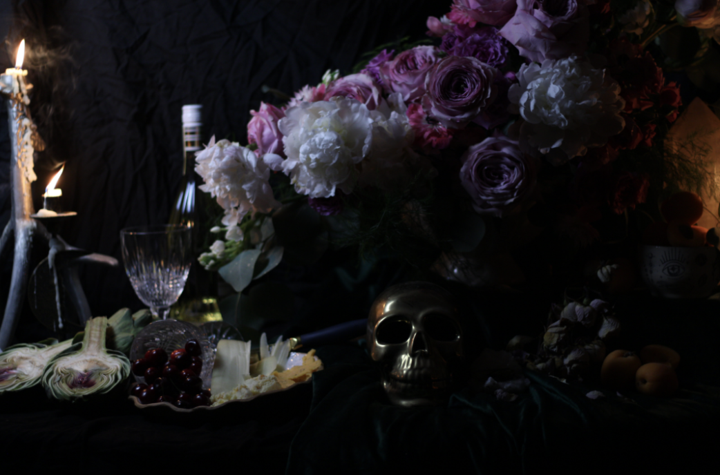 The still life was constructed entirely in the studio. The ceramic vessels featured in the composition were designed and hand-built in the studio. The botanical arrangement was sourced, conditioned, and composed to balance the tension between abundance and decay. I used fresh blooms alongside dried roses, ripened fruit, cicada exuvia, and crystals. Every object was chosen for its texture, symbolic weight, and tonal value within the frame.